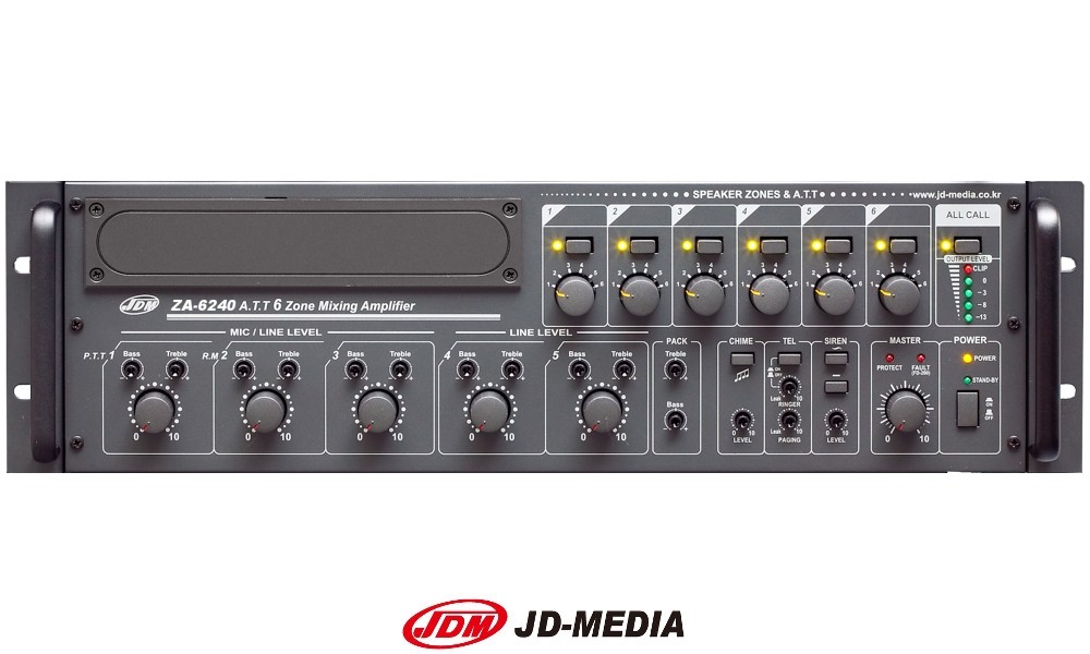 JD-MEDIA ZA-6240 - Mischer-Zentrale mit einer Leistung von 240W RMS auf sechs Hi-Z/100V Zonen à max. 40W oder 4Ω. Ausgestattet mit Mic/Line-Eingängen, Phantomspeisung, Pegelanpassung, 2-Band EQ, Prioritätsschaltung, Remote-Eingang für optionale Sprechstelle, 6-fach Lautsprecher-Zonenschaltung mit Leistungs-Abschwächer, 2/4-Klang Gong, Sirene, Fern-Einschaltung und einem Anschluss für Notstrombetrieb/USV ausgestattet.