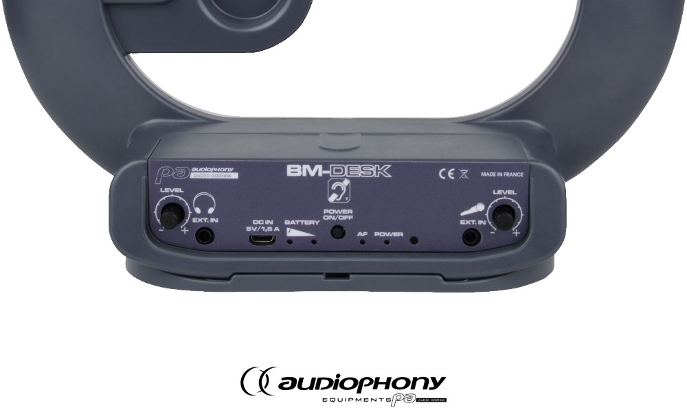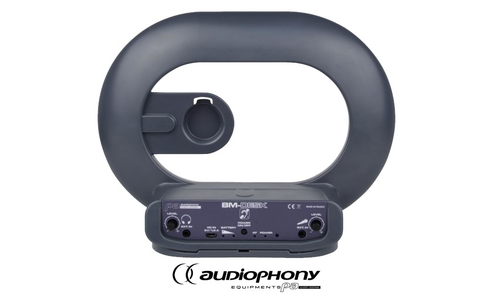AUDIOPHONY BM-DESK - Le système portable constitue l’interface de communication optimale entre vous et les personnes malentendantes. Peut être orienté et déplacé selon les besoins. Convient pour une surface de 1,2 m² et des appareils auditifs avec fonction T/MT. Adapté pour une utilisation sur un interrupteur, à la réception, au bureau ou à domicile. Le système d’alimentation secteur et batterie par induction est équipé d’un microphone intégré, d’un amplificateur, d’une entrée micro/Audio et est prêt à l’emploi immédiatement !