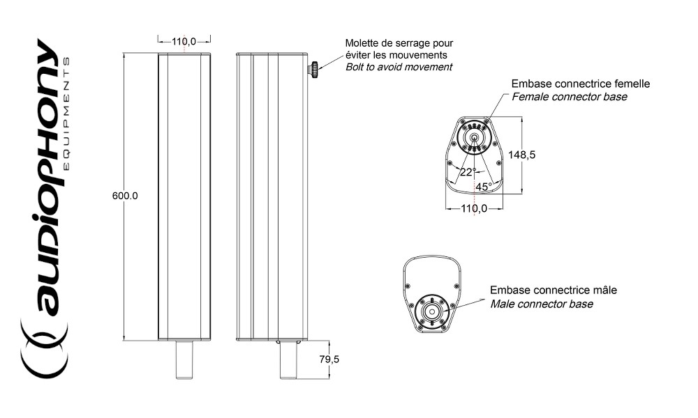 AUDIOPHONY iLINEspace60w - Extension blanc 60cm avec bride enfichable. Permet de surélever les enceintes colonnes pour les positionner de manière optimale. Convient pour iLINE83Bw, iLINEsub12Aw, iLINEsub12Pw et iLINEbasew. Boîtier en aluminium avec connexion enfichable et connexion du haut-parleur. Sur la face supérieure, bride avec 3 positions d'encliquetage -22.5°/0°/+22.5° et écrou de sécurité. Dimensions L679mm x l110mm x P 148.5mm (connecteur inclus), poids 2.8kg.