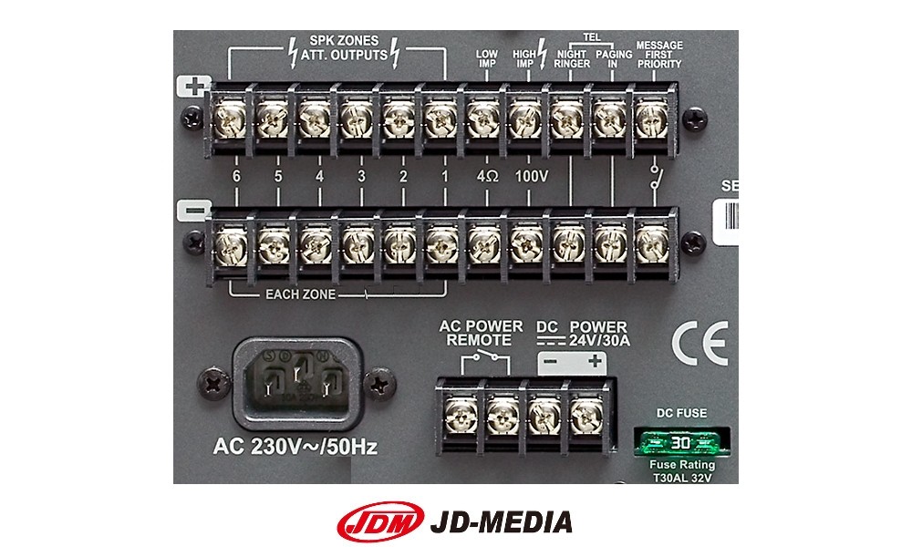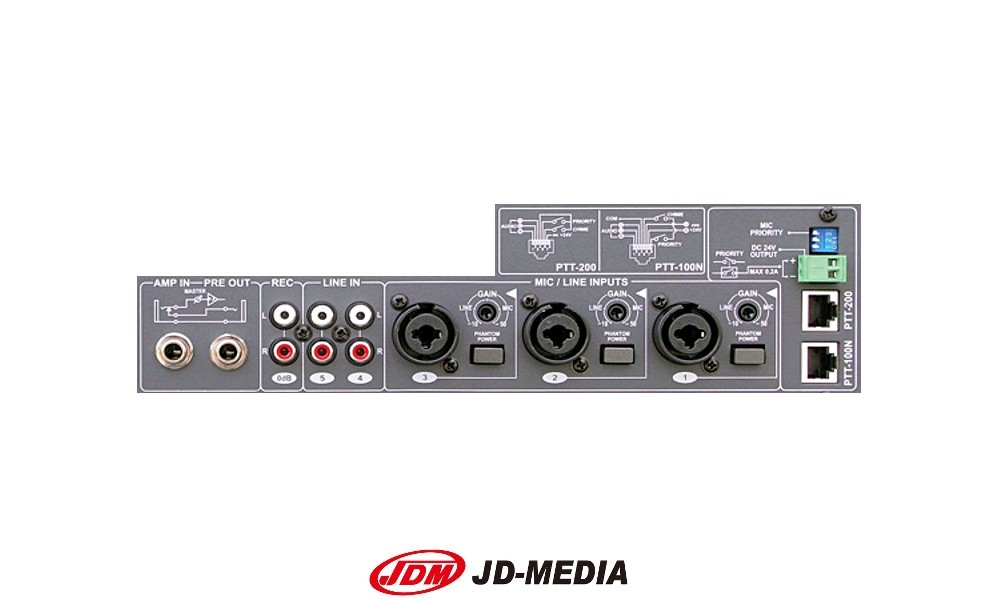 JD-MEDIA ZA-6480 - Centrale de mixage avec une puissance de 480W RMS sur six zones Hi-Z/100V de max. 80W ou 4Ω. Équipée d'entrées micro/ligne, d'une alimentation fantôme, d'un réglage de niveau, d'un égaliseur 2 bandes, d'un circuit de priorité, d'une entrée à distance pour un poste d'interphonie en option, de 6 zones de haut-parleurs avec atténuateur de puissance, gong 2/4 sons, sirène, mise en marche à distance et d'une prise pour alimentation de secours/USV.