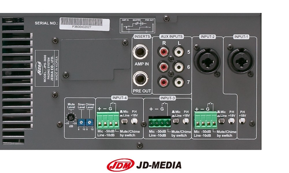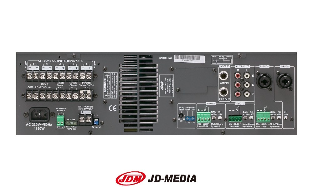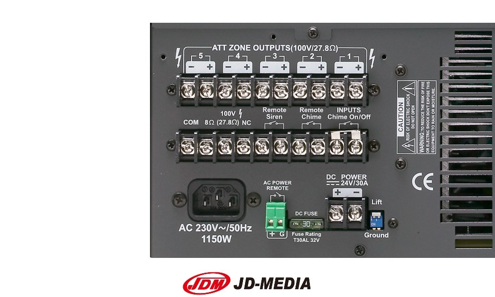JD-MEDIA PS-3240 - Centrale de mixage avec une puissance de 240W RMS sur cinq zones Hi-Z/100V à 45W max. En alternative, une sortie haut-parleur à basse impédance (8Ω) est disponible. Équipée d'entrées micro/ligne, d'une alimentation fantôme, d'un circuit de zone à 5 haut-parleurs avec atténuateur de puissance, d'un gong à 2 tonalités, d'une mise en marche à distance et d'une connexion pour alimentation de secours/USV. La centrale est protégée contre la surchauffe et les courts-circuits. Un ventilateur contrôlé par la température refroidit l'étage final.