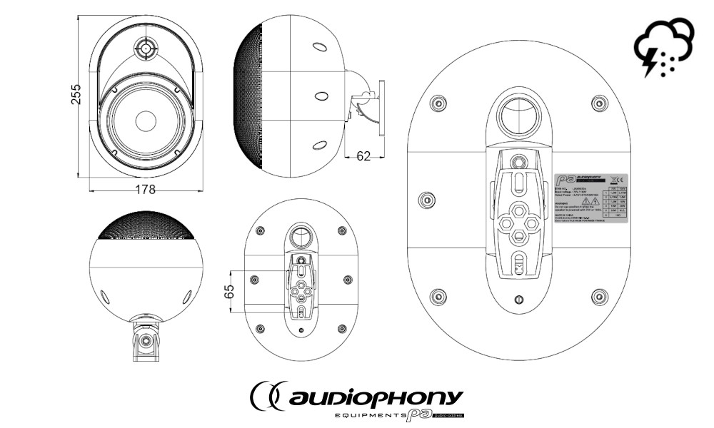AUDIOPHONY JAVA530 - Haut-parleur 2 voies discret et élégant avec une très bonne reproduction audio - parfait pour l'intérieur et l'extérieur (indice de protection IP55). Peut être utilisé en basse impédance ainsi que dans des installations Public Address 100V. Puissance 30W RMS, adaptation de puissance 100V par commutateur 3.75W-7.5W-15W-30W ou 16 Ohms.