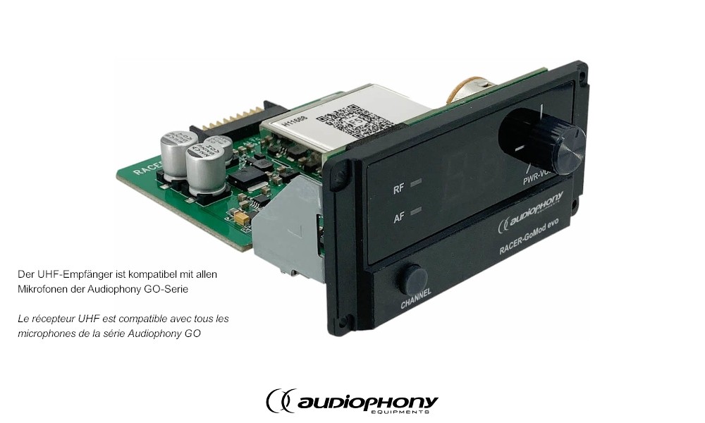 AUDIOPHONY RACER GO-MOD/F5evo - Module récepteur UHF pour la série RACER EVO. 8 fréquences sélectionnables. Le récepteur est compatible avec tous les émetteurs de poche et microphones de la série GO. Fréquence de réception 514-542MHz.