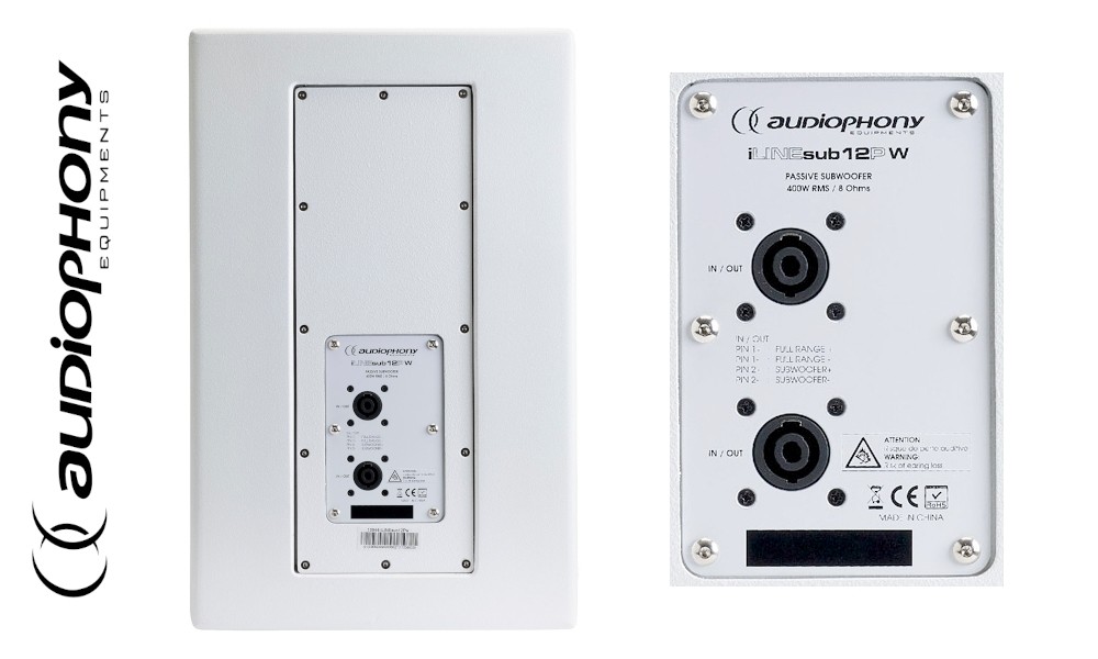 AUDIOPHONY iLINEsub12Pw - Subwoofer passif 12" blanc, puissance 400W RMS et 800W Peak à 8Ω. S'adapte à la série iLINE ou aux systèmes de haut-parleurs existants. Le câble de connexion correspondant (Audiophony iLINEcord60) pour le raccordement au subwoofer actif iLINE12sub12A se trouve dans les accessoires.