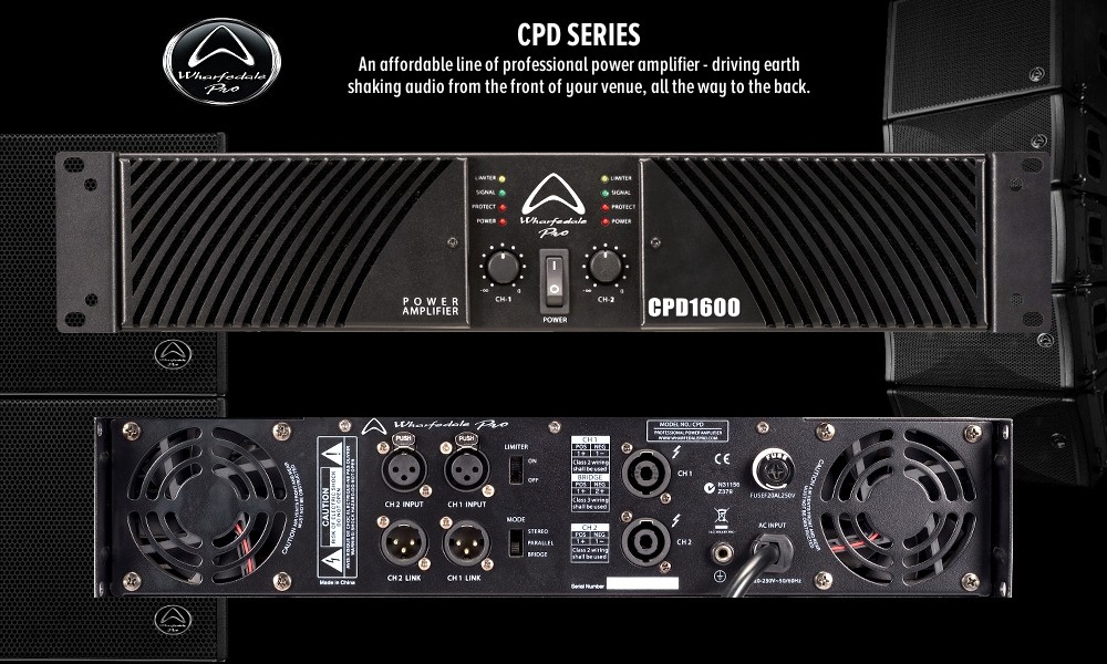 WHARFEDALE PRO CPD1600 - Amplificateur de puissance 2 canaux classe A/B. Puissance 2 x 400W RMS/8Ω, 2 x 620W RMS/4Ω, mode Bridge 1200W RMS/8Ω. Circuits de protection complets et limiteur commutable. Filtres faciles à nettoyer grâce aux grilles avant amovibles. Fans à température contrôlée.
